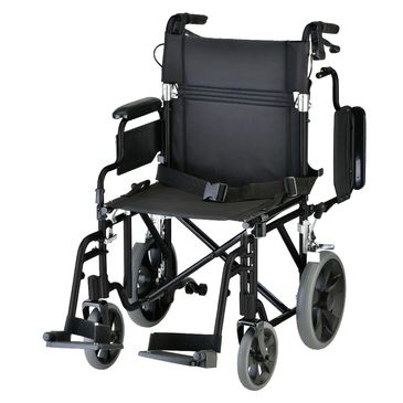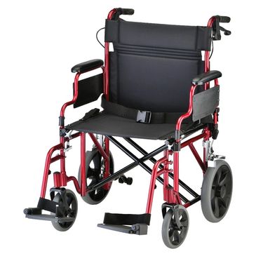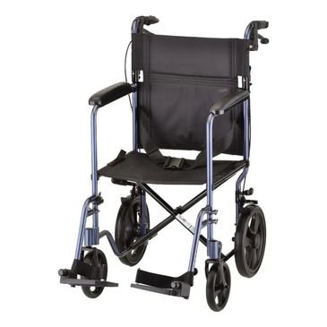 The Transport Chair with Hand Brakes has a lightweight aluminum frame. It is foldable and has a quick release fold-down back, fixed full-length arms for added comfort. This transport chair has locking rear wheels as well as locking hand brakes.